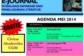 Perpustakaan UGM akan menyelenggarakan Pelatihan Akses e-Database (Sosialisasi Database dan Penelusuran Literatur Periode Mei 2014). Pelatihan ini gratis untuk Civitas Akademika UGM. Agenda Mei 2014, sebagai berikut: