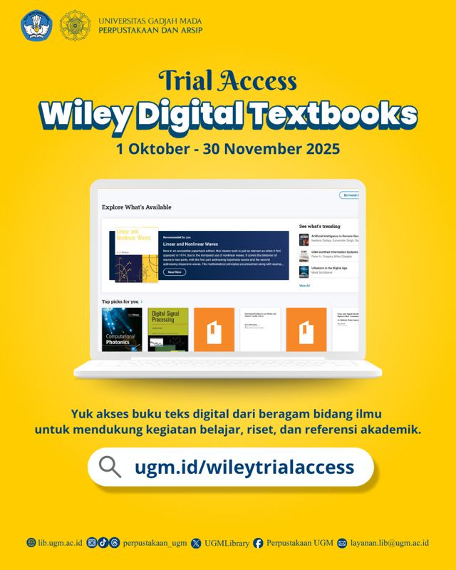 Mulai 1 Oktober – 30 November 2025, seluruh civitas academica UGM dapat menikmati akses gratis ke ribuan buku teks digital dari berbagai bidang ilmu. Wiley Digital Textbooks dapat diakses dari mana saja, baik di dalam maupun luar kampus melalui UGM Remote Access.