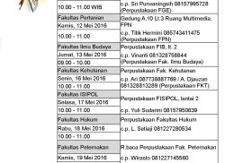 Perpustakaan Universitas Gadjah Mada bekerjasama dengan Forum Perpustakaan Perguruan Tinggi Indonesia (FPPTI) Pusat dan FPPTI Daerah DIY mengadakan rangkaian kegiatan yang dikemas dalam Semiloka Kepustakawanan Indonesia 2016. Kegiatan ini akan dilaksanakan di Perpustakaan Universitas Gadjah Mada selama 3 (tiga) hari, 12-14 Oktober 2016. Adapun beberapa kegiatan yang dilaksanakan adalah: