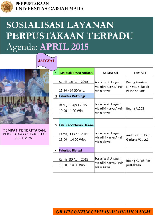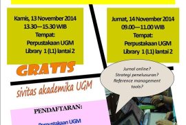 Pelatihan ini gratis bagi civitas academica UGM. Yang berminat silakan mendaftarkan diri dengan menghubungi Ibu Roh Wahyu (081328265526) di Perpustakaan UGM.