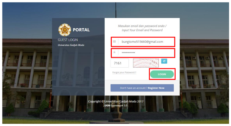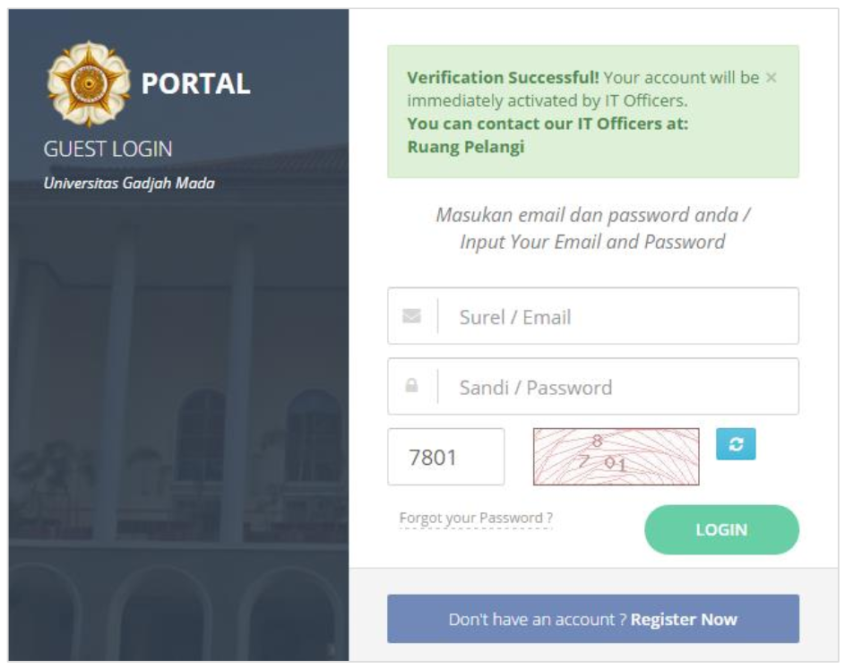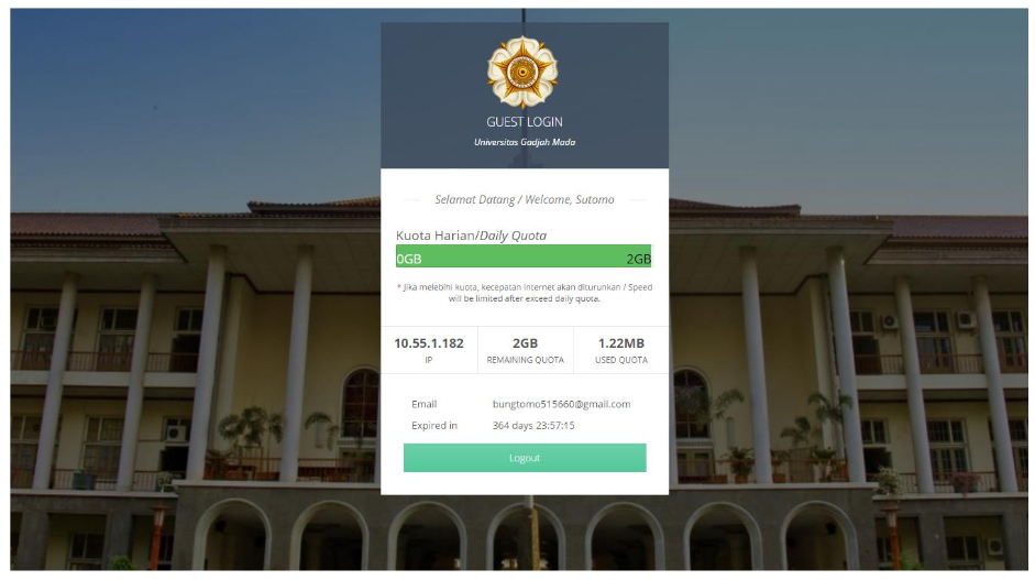 - Connect the device to the Internet (Hotspot / Cable Connection), open the browser (e.g. Google Chrome, Mozilla). Go to http://internet.ugm.ac.id. The page will automatically go to the Login Portal as shown below: