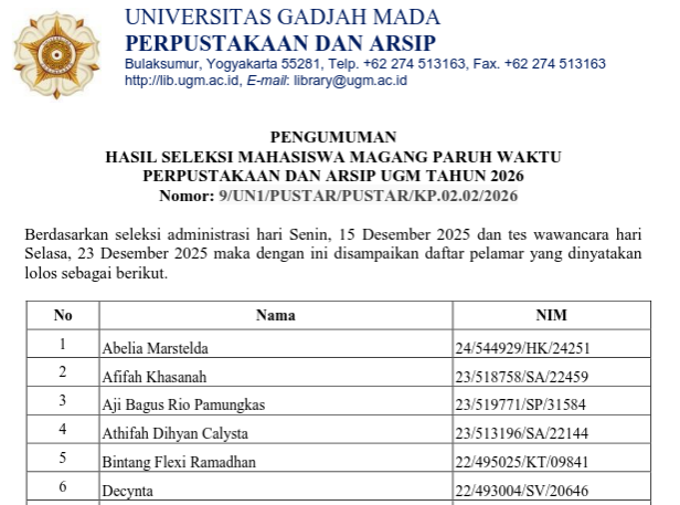 Pengumuman Hasil Seleksi Mahasiswa Magang Paruh Waktu Perpustakaan dan Arsip UGM 2026