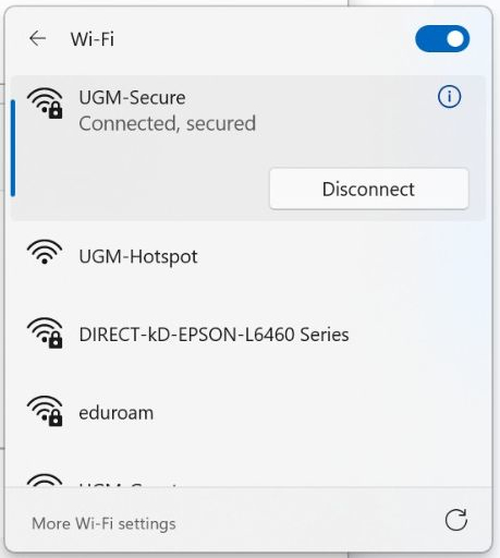 Perangkat yang Anda miliki akan secara otomatis mendeteksi keberadaan access point di Perpustakaan UGM. Dari beberapa access point yang terdeteksi oleh perangkat Anda, terdapat access point yang mewajibkan Anda untuk mengisi password untuk proses otentikasi. Gunakan access point yang paling memungkinkan untuk Anda gunakan. Apabila satu access point tidak dapat terkoneksi dengan perangkat Anda, cobalah melakukan koneksi dengan menggunakan access point yang lain.