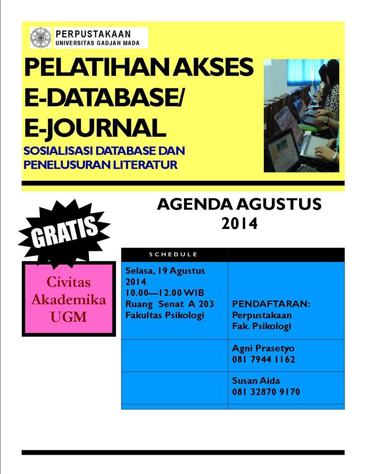 Perpustakaan UGM akan menyelenggarakan Pelatihan Akses e-Database (Sosialisasi Database dan Penelusuran Literatur Agustus 2014). Pelatihan ini gratis bagi Civitas Akademika UGM.